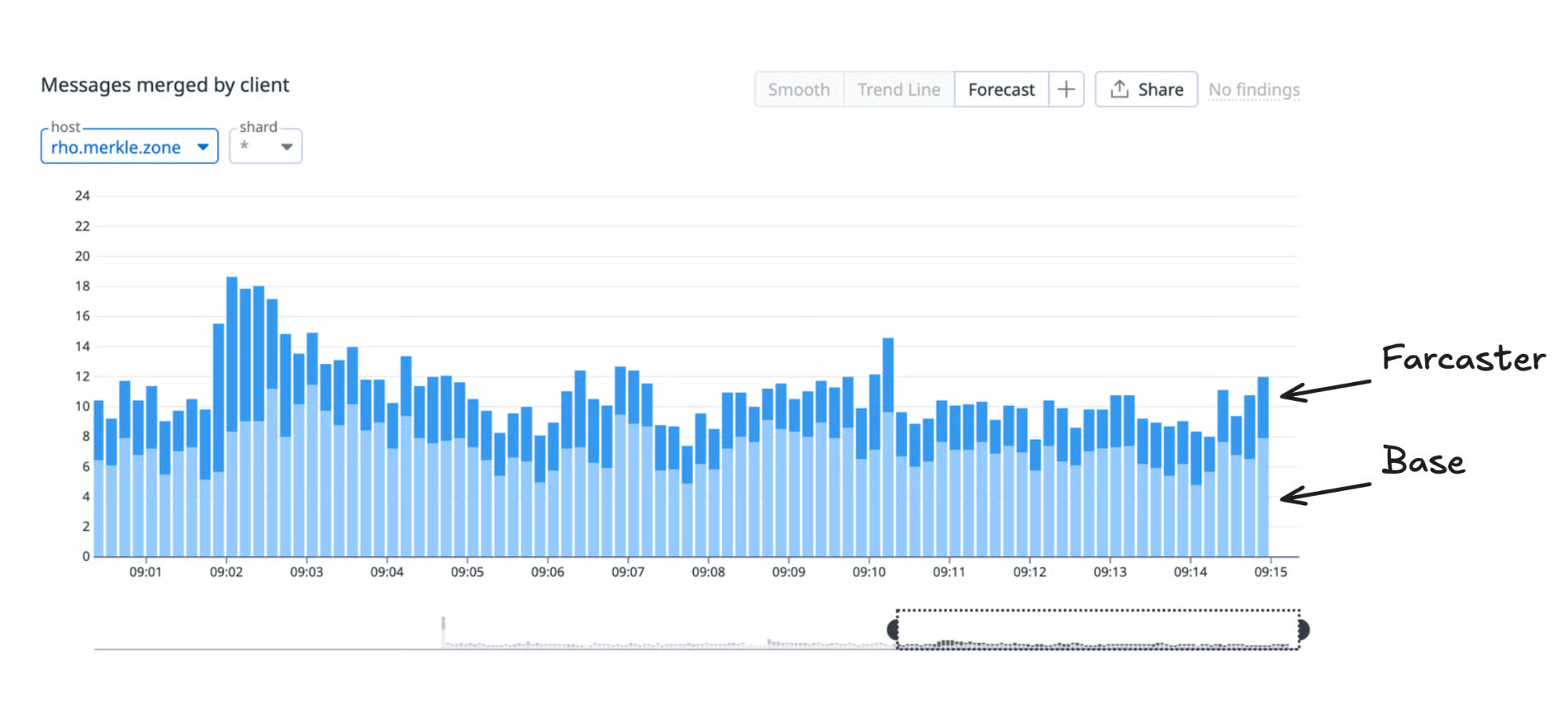 The chart above shows how the Base and the Farcaster apps compare in terms of messages sent on the Farcaster social graph.